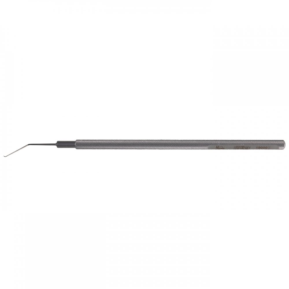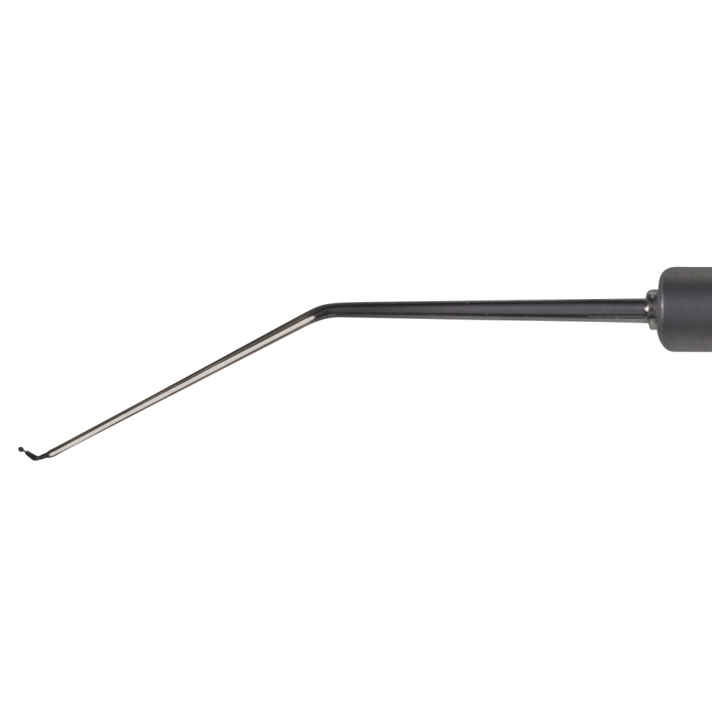 (Button tip)"Diabolo" manipulator hook. Angled, active part with a bulbous micro-collar button tip. Can be used to hold and divide the lens during phacoemulsification during cataract surgery.